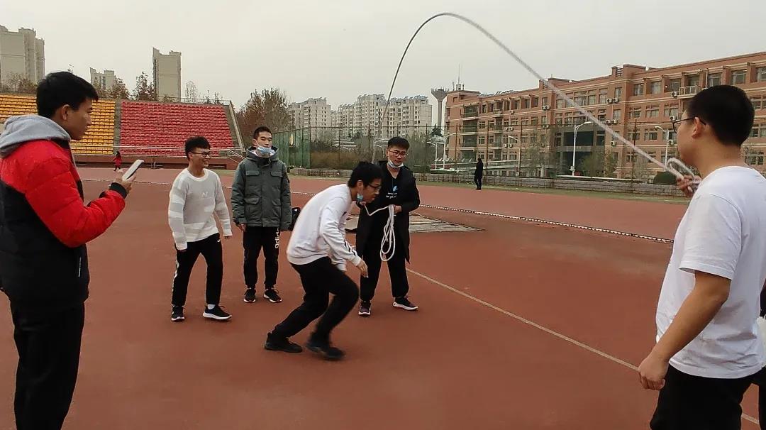 随后,各班各自进行“八字跳”活动,即所有同学轮流迅速进入跳绳。在几次练习后,各班同学逐渐掌握要领,配合愈加默契,对时机的掌握也更加精准。在最终的两分半计时中,各班同学均一个接一个,几乎无空隙地跳出了优良的成绩。同学们灵活的身影充分展现了土建学子蓬勃的朝气,成为了冬日风雨操场上一道热情亮丽的风景线。