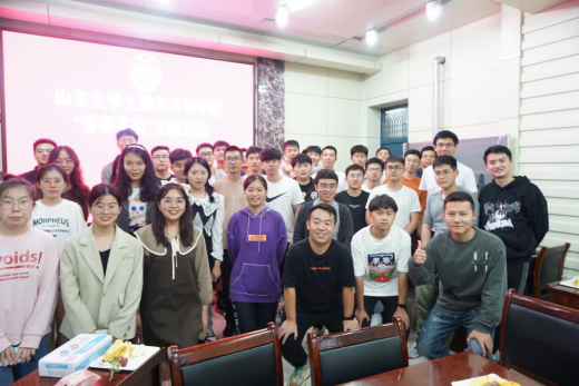 及学院的概况。同时韩教授结合自己的亲身经历,用幽默风趣的语言从“你是谁”、“你来干什么”和“你要去哪儿”三方面分享自己的科研感悟。首先,他以山大校训和办学宗旨为导向,以数据为依据,教导我们要做天之骄子国之栋梁,将个人发展与国家发展相结合,为国家谋复兴图富强;其次他强调要严谨做事,强化沟通交流和协调规划能力,形成强大的内心和坚强的意志,不惧困难和挑战,勇攀高峰;最后他提出研究生要及时做好职业规划,找寻人生的意义,实现自己的人生价值。韩教授表达了自己对学生的殷切期望,希望同学们能够在山大生活快乐,学业有成,为祖国的发展贡献自己的力量!同学们纷纷表示受益匪浅。