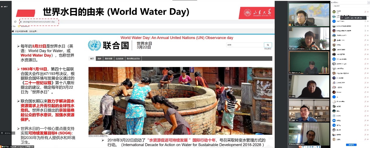 水工党支部联合共建单位卧虎山水库服务处党支部和乔店水库服务处党支部,于2022年3月20日下午共同举办了2022年“世界水日”“中国水周”线上主题宣传活动,2022年“世界水日”的主题为“珍惜地下水,珍视隐藏的资源”,“中国水周”的主题为“推进地下水超采综合治理,复苏河湖生态环境”。此次活动旨在向全校师生宣传世界水日-中国水周,培养爱水、护水、节水意识,增强水利学生的专业认同感。