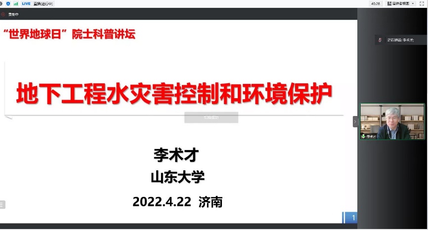李术才院士,分别做了题为《试论中国的绿色能源》和《地下水灾害控制与环境保护》的科普讲座。讲坛得到了山东省科学技术协会、中国地球物理学学会的指导和支持,有全国二十多家相关单位、千余人通过线上线下方式参与。山东省科协党组成员陈爱国副主席为开幕式致辞,参加会议的专家还有中国地球物理学会秘书长郭建、山东省地球物理学会名誉理事长刘元生、理事长张善法等。讲坛由山东省地球物理学会副秘书长杨洋副教授主持。