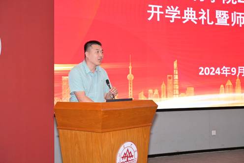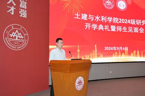 晚上7时,开学典礼在雄壮的国歌声中正式拉开序幕。院长张庆松对2024级研究生表示热烈欢迎。随后他为同学们详细介绍了学院概况、师资队伍、人才培养、毕业去向等内容。他希望同学们要领悟“为天下储人才、为国家图富强”的办学宗旨,接续传承“家国情怀、担当精神、崇实品格、创新素养”的山大基因。从这所百廿名校的深厚底蕴和雄厚实力中,不断汲取奋进前行的力量,成长为山大历史长河中的璀璨明星,做强国建设、民族复兴征程上的建设者与接班人。