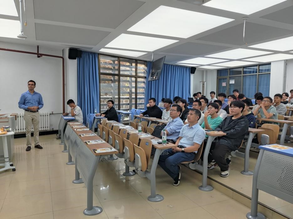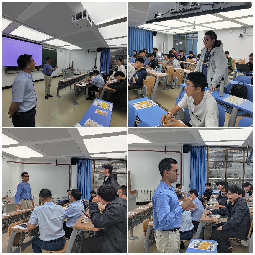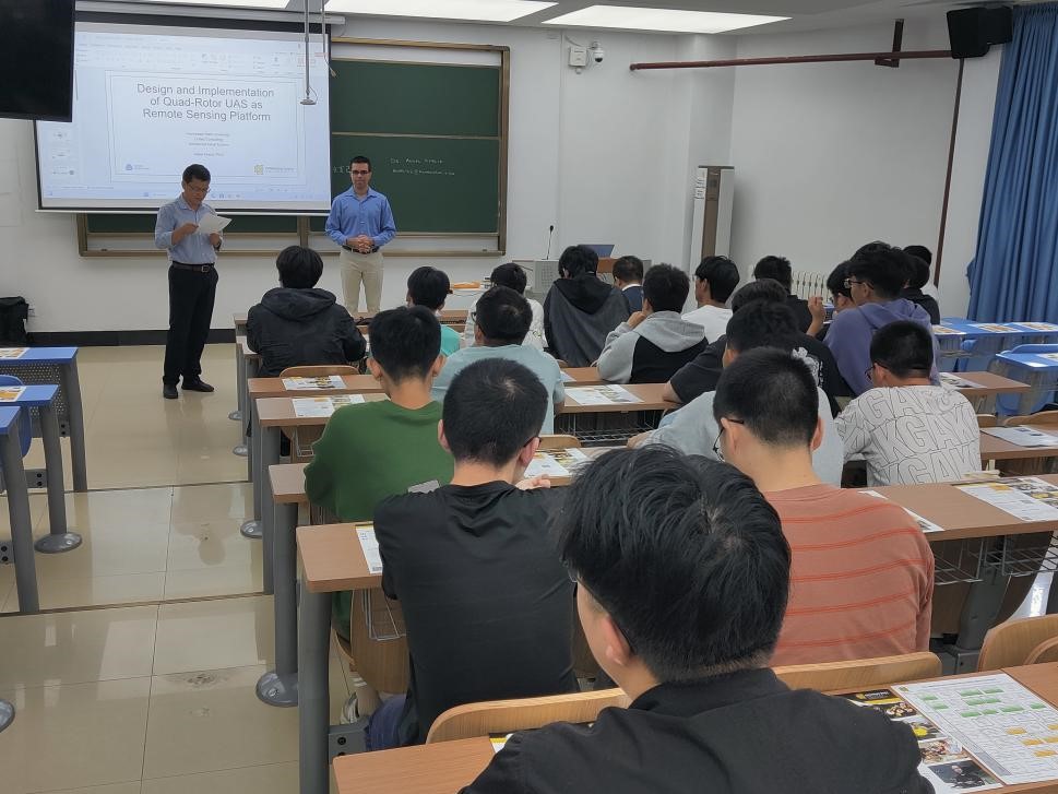随后,Adeel Khalid教授作题为“Design and Implementation of Quad-Rotor UAS as Remote Sensing Platform”的学术报告,介绍了四旋翼无人机系统的设计目的、设计理念、运用领域及研究进展。Adeel教授运用讲授与问答相结合的方式,鼓励同学们主动思考,向同学们抛出专业及研究方法等问题。在场同学积极互动,踊跃发言。