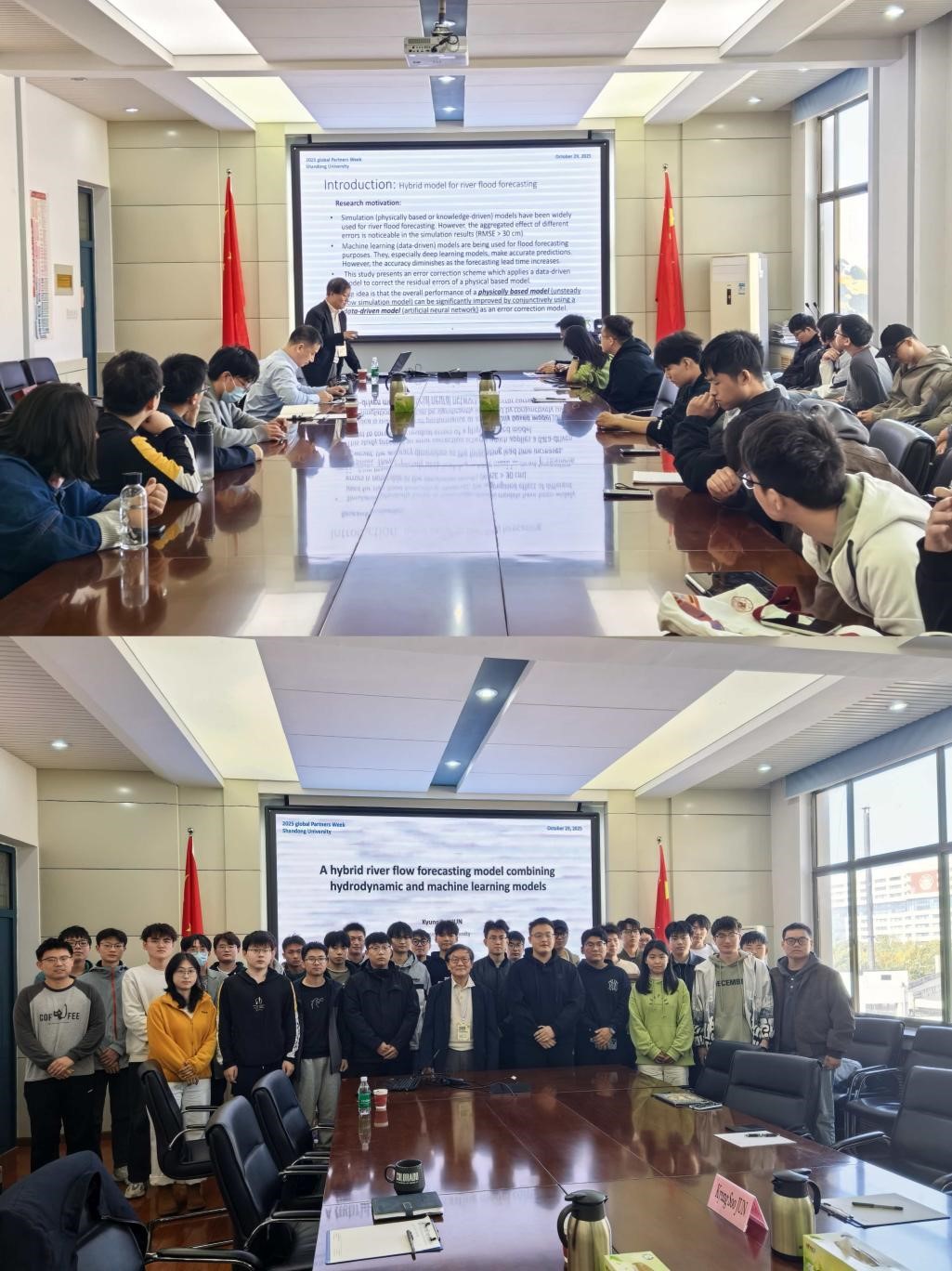10月29日上午,成均馆大学水资源研究生院院长田庚秀(Kyung Soo JUN)赴学院开展学术研讨,副院长毛德强主持报告并致辞。田教授发表题为“A hybrid river flow forecasting model combining hydrodynamic and machine learning models”的报告,提出一种基于水动力模型优化与误差校正建模相结合的混合方法,通过综合利用物理系统的不同特征来提高洪水水位预报精度。现场共计30余位学生参与,师生积极互动交流。
