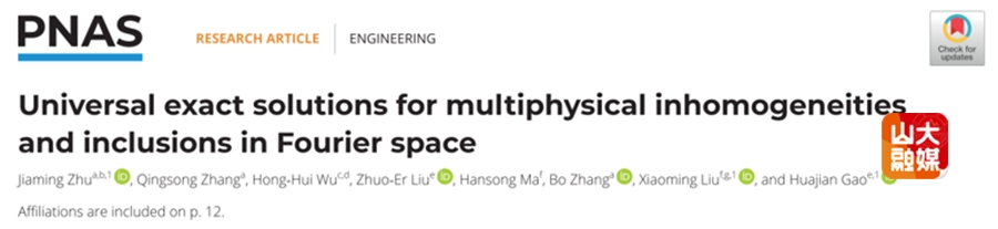 教授朱家明,联合清华大学高华健院士团队、中科院力学所刘小明研究员团队在《美国科学院院刊》(PNAS)发表研究论文“Universal exact solutions for multiphysical inhomogeneities and inclusions in Fourier space”。该研究建立了广义等效夹杂方程通用精确解,统一了单夹杂和多夹杂体系理论框架,建立了多物理复合材料平均模量精确解,提出了任意形状裂纹应力强度因子通解。这项突破性工作解决了固体力学、固体物理和材料科学等多学科的长期难题。该研究得到了国家自然科学基金、山东省自然科学基金和广东省自然科学基金等资助。