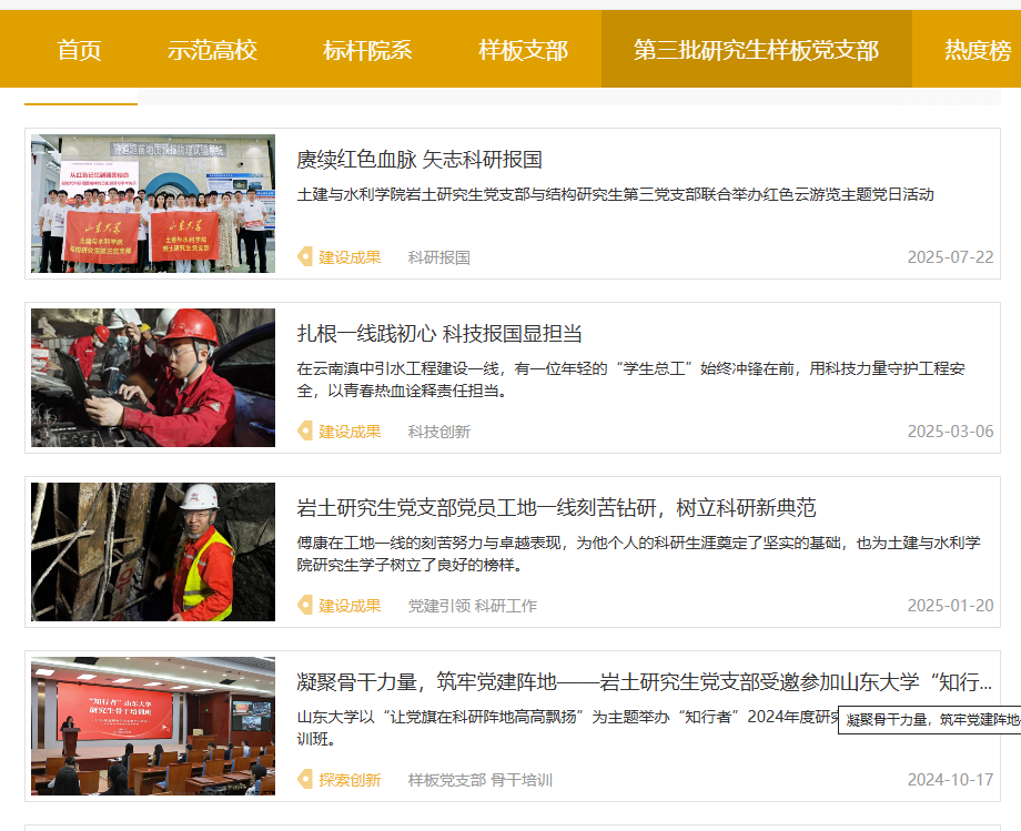 新闻网等权威平台,发布深度报道。开展“红色云游览”等线上直播,通过“山大研究生”视频号直播隧道工程灾变防控与智能建养实验室,由党员现场讲解技术难点,线上互动超300人次,实现党建与科研的“破圈”传播。支部还参与新时代高校党建论坛,在“一融双高”工作论坛上作经验报告,推广党建创新做法。通过多渠道宣传,支部展示了党员风采、科研进展和社会实践,提升了党建品牌影响力。