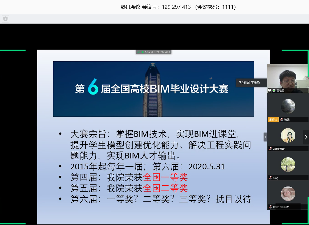 本次会议中王培军从实践能力、科研创新和疫情期间的建议三个方面开展本次交流。实践能力方面,他明确了实践能力是全面发展的需要并介绍了间接训练和直接训练两种提升实践能力的方法。间接训练包括课堂练习和网络学习两方面,直接训练包括实习、实验、试验和竞赛四个方面。他还介绍了结构赛、挑战杯、BIM设计赛等比赛概况以及我校获奖情况。王培军为同学们参加竞赛提供了两种思路:一种是黑盒子式探索,即尝试不同的输入,观察输出的变化;另一种是理论指导下的实践,即从材料、构件和节点的性能进行分析。在科研创新方面,王培军首先结合具体事例对新理论、新方法、新对象、新现象四个概念进行了具体阐释。同时,他介绍了装配式建筑、建筑自动化和大数据在建筑中的应用等相关内容,强调了它们未来前景广阔的发展方向。最后他提醒同学们疫情期间不是假期,应该严格要求自己。他建议同学们可以学习一些常用的办公软件,多读书,多锻炼身体,利用这段时间更好地充实自己。