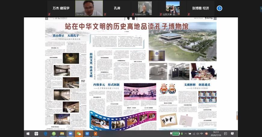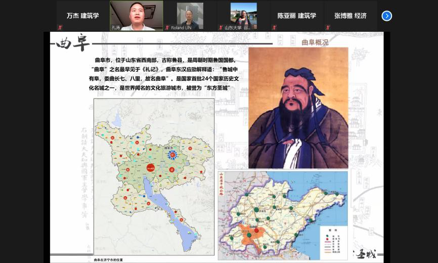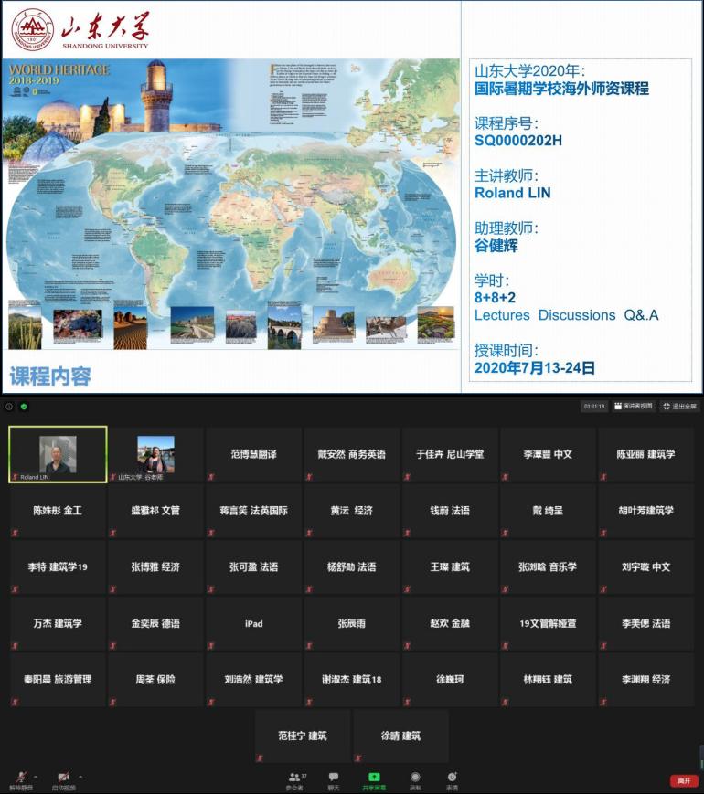 建筑学系谷健 辉老师辅助教学,孔子博物馆副馆长杨金泉先生和曲阜市名城设计院院长孔涛先 生应邀参与课程讨论并分享了关于曲阜世界文化遗产地保护和发展的学术报告。 课程通过对不同类型遗产的案例解析,全面系统介绍了世界文化遗产保护与管理 的理念与经验。全校共 34 位同学通过 ZOOM 软件全程参与了此课程学习。