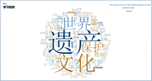 本课程是首次开设的海外师资课程。为了实现最佳教学效果,谷健辉老师全 程参与了教学组织和学情跟踪。课前设计了课前小问卷,了解同学们对课程学习 的准备和学习期待;课程结束后设计了结课小问卷,对同学们学习收获和问题进 行调研。通过谷老师对问卷的分析,反映出同学在短时间对学习效果较为满意, 对教学内容关键问题有了清晰的认识和理解,并能遵循世界遗产公约和指南对文 化遗产展开自己的分析。
