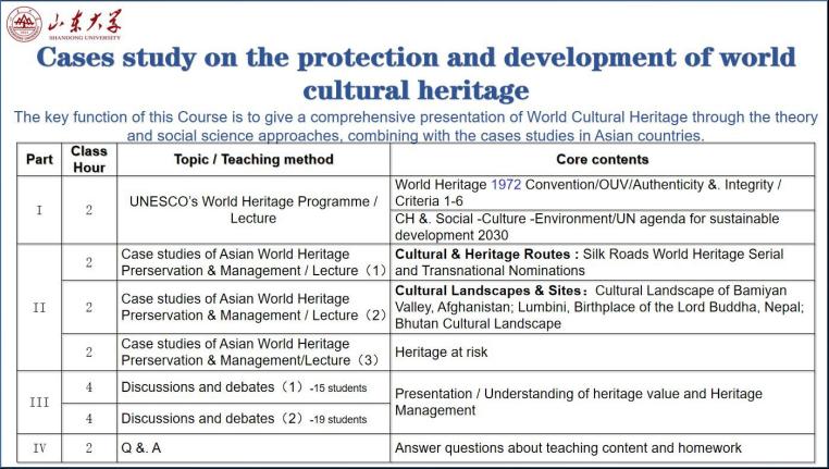 暑期海外师资项目“世界文化遗产保护与发展国际经验解析”[SQ0000202H]顺利进行。本次暑期课程包括四次讲座、 两次交流讨论和一次答疑环节。课程由联合国教科文组织(UNESCO)法国总部世 界遗产中心专员 Roland LIN 教授主讲,手机比分-win007手机版
