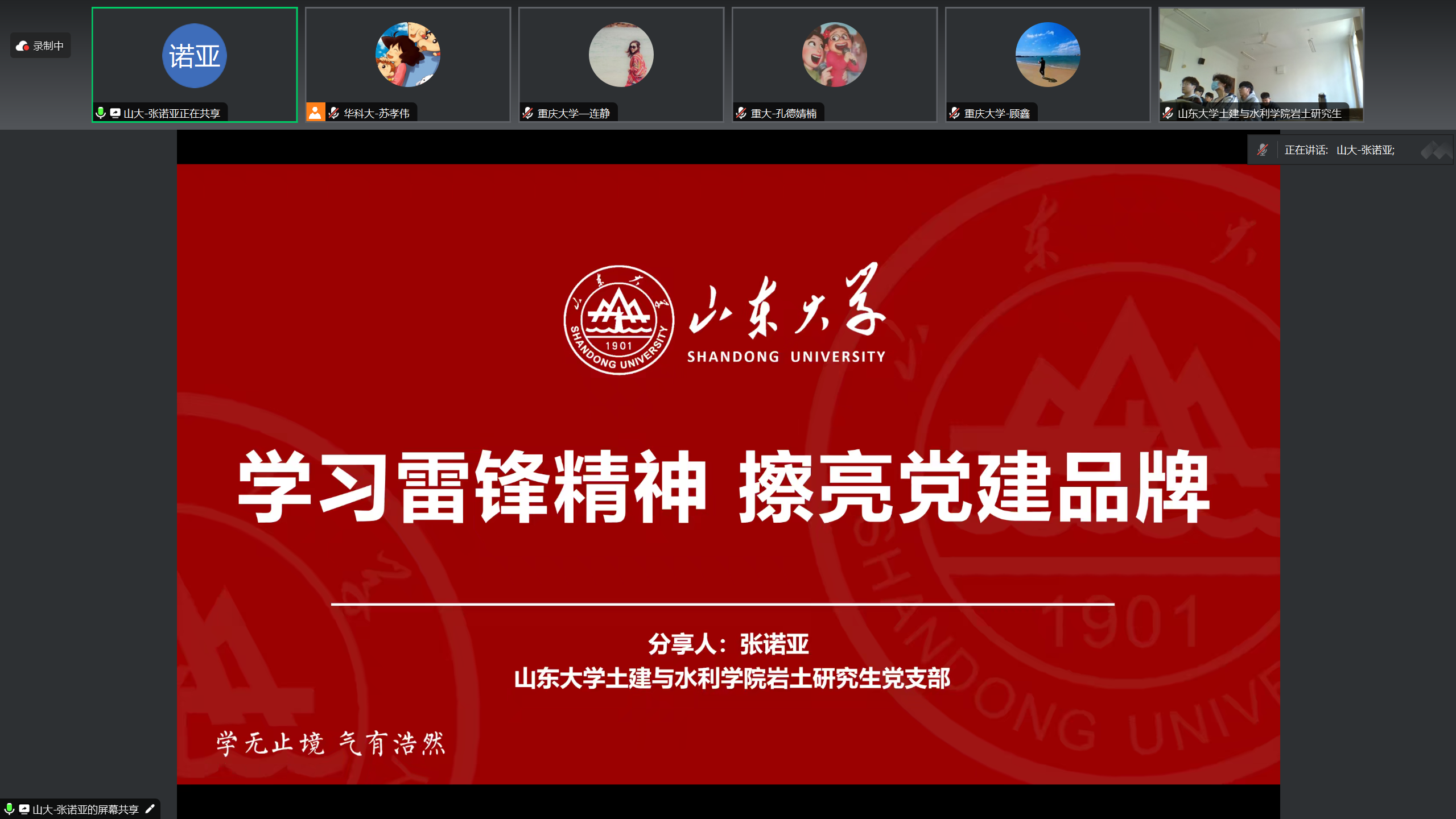 岩土研究生党支部的张诺亚作主题为《学习雷锋精神,擦亮党建品牌》的党建工作经验分享,她讲述了雷锋精神的由来、解读和传承,通过鲜活的案例分享为作为新时代新青年的我们树立了“学习雷锋”的标杆,用实际行动诠释了“把党支部建在科研团队上”,实现了党建与业务“双核”协进、相融相促,打造“党建+”工作新局面。