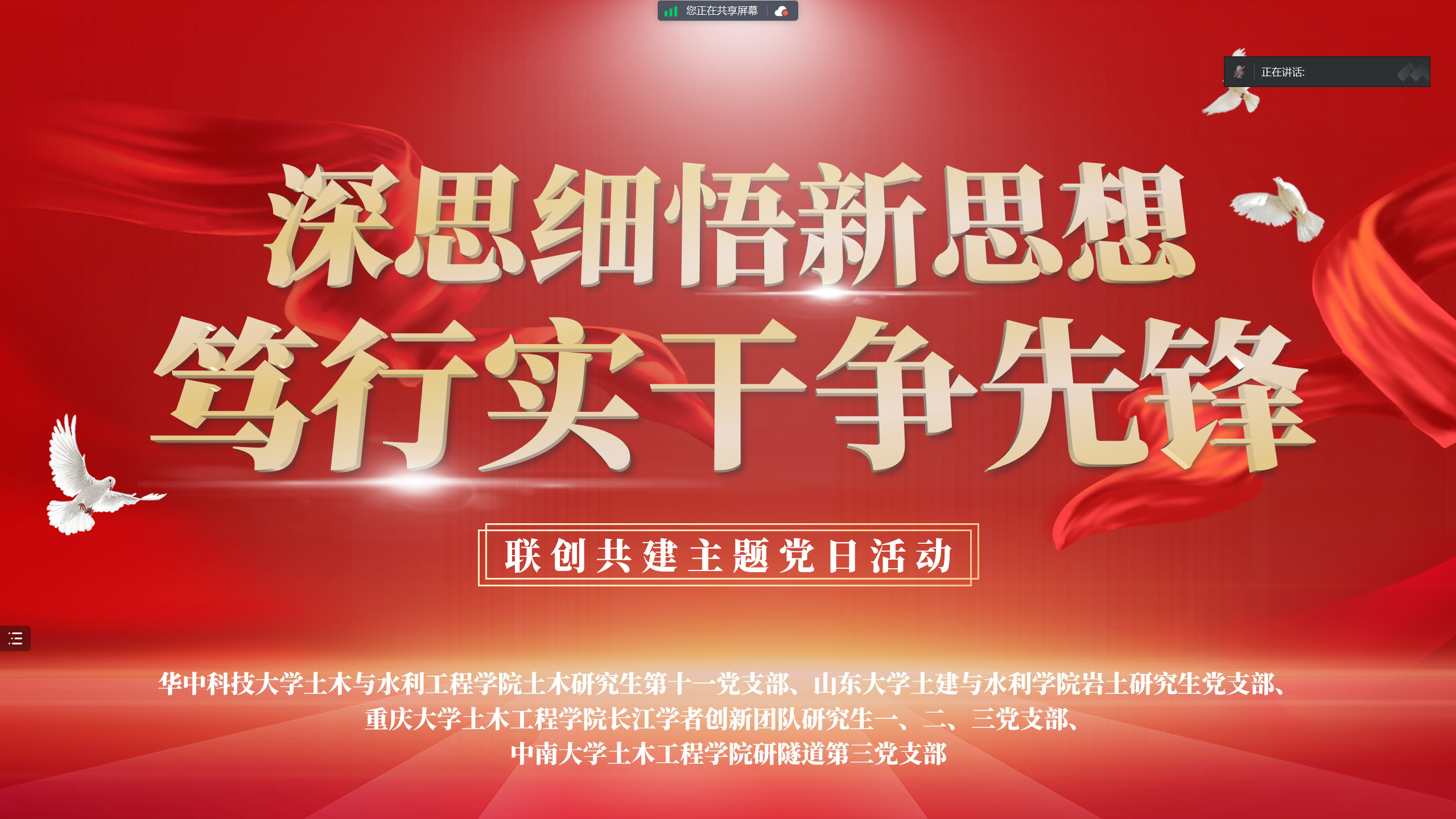 岩土研究生党支部、华中科技大学土木与水利工程学院土木研究生第十一党支部、重庆大学土木工程学院创新团队研究生一、二、三党支部、中南大学土木工程学院隧道第三党支部“线上会议+线下会场”超200名学生党员参加活动。