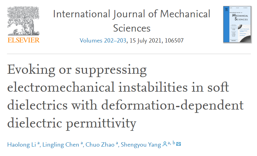 工程力学专业2018级本科生李浩隆和赵绰同学在国际期刊《International Journal of Mechanical Sciences》发表了题为《Evoking or suppressing electromechanical instabilities in soft dielectrics with deformation-dependent dielectric permittivity》的SCI论文,影响因子4.631,JCR一区 (力学类,工程机械类)。