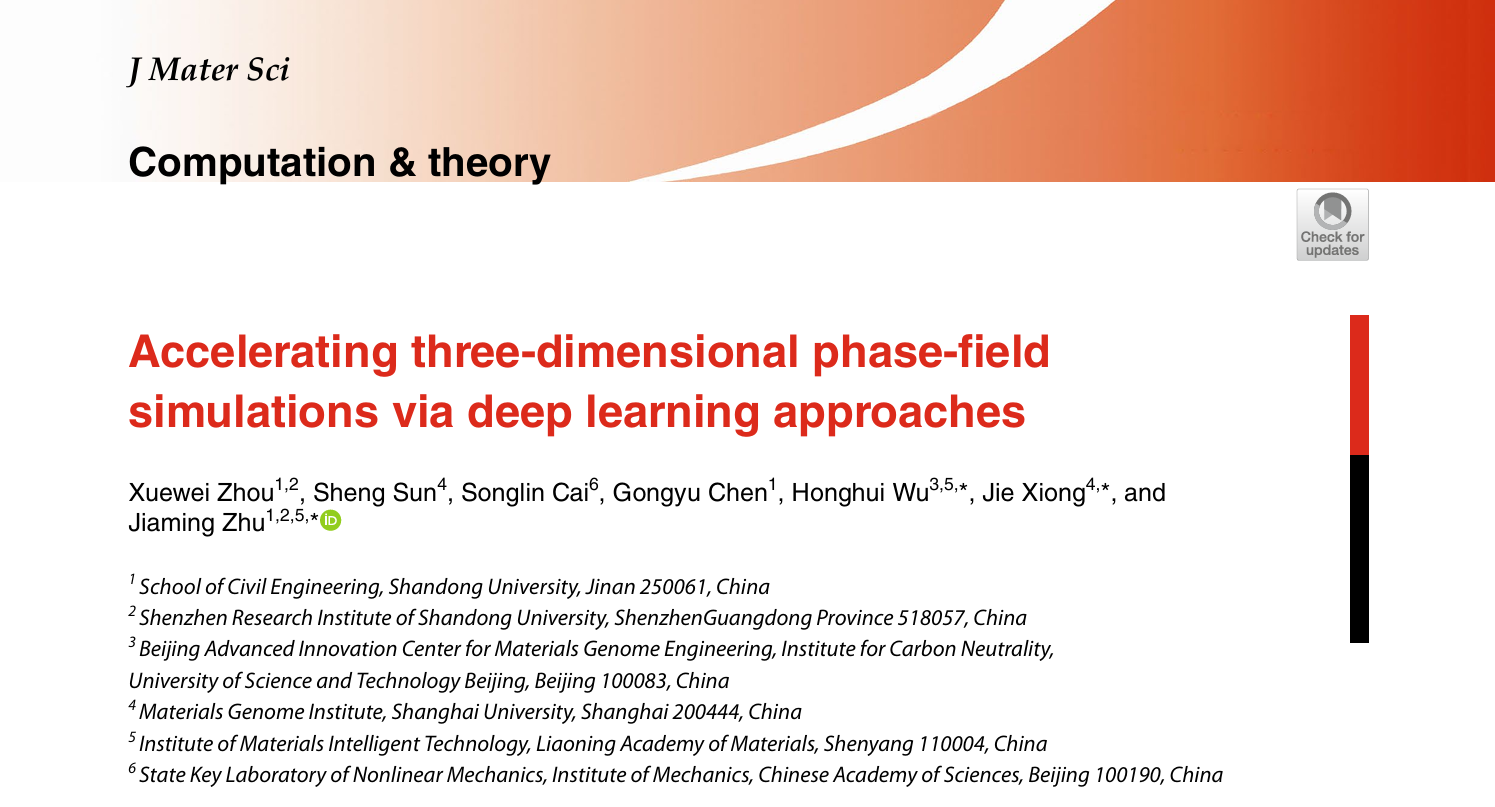 相关成果以 Accelerating three-dimensional phase-field simulations via deep learning approaches为题,发表在国际学术期刊《JOURNAL OF MATERIALS SCIENCE》上。工程力学系朱家明教授为本文的通讯作者,硕士研究生周学伟为第一作者,该论文得到了国家自然科学基金、山东省自然科学基金的支持,win007手机版