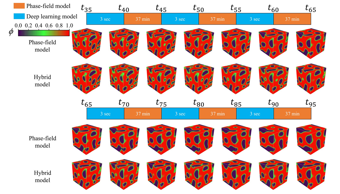 朱家明教授课题组开发了基于卷积神经网络算法的相场模拟代理模型,实现了对微结构演化的时-空预测,提升了代理模型的计算精度,计算误差比国际报道小一个数量级。此外,该代理模型在预测三维结构的时-空演化过程时也表现出较高的精度,为高通量、高精度、高维度、大体系、长时段材料计算奠定了基础。