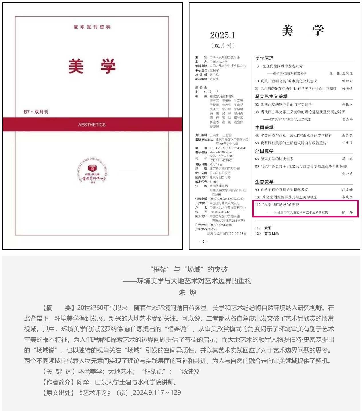 建筑学系陈烨老师的学术论文《“框架”与“场域”的突破——环境美学与大地艺术对艺术边界的重构》(原载于《艺术评论》2024年第9期),被人大复印报刊资料《美学》2025年第1期全文转载。