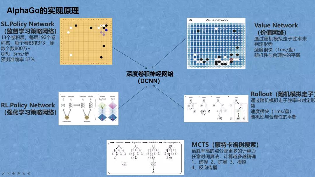 在本次线上交流中,曹博文关于围棋AI中的AlphaGo整体算法进行了深入浅出的分享 。首先曹博文简单讲解了深度卷积神经网络(DCNN)的核心思想。之后,他介绍了Deepmind团队基于DCNN实现的四个“大脑”:SL.Policy Network(监督学习策略网络)RL.Policy Network(强化学习策略网络),Rollout(随机模拟走子),Vaue Network(价值网络)。