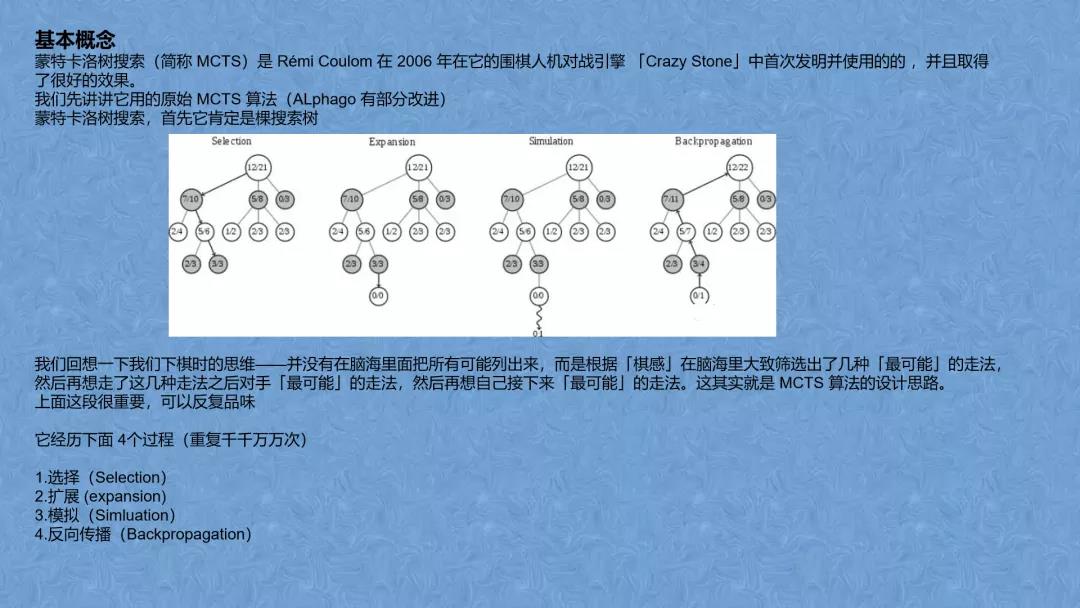 接着,曹博文通过与传统博弈游戏树搜索算法--极大极小搜索进行对比,点明了传统算法解决围棋问题的困难性,引出了AlphaGo整体算法的框架,也是算法核心--蒙特卡洛树搜索。蒙特卡洛树搜索的主要概念是搜索,即沿着博弈树向下的一组遍历过程。单次遍历的路径会从根节点(当前博弈状态)延伸到没有完全展开的节点,未完全展开的节点表示其子节点至少有一个未访问到。遇到未完全展开的节点时,它的一个未访问子节点将会作为单次模拟的根节点,随后模拟的结果将会反向传播回当前树的根节点并更新博弈树的节点统计数据。一旦搜索受限于时间或计算力而终止,下一步行动将基于收集到的统计数据进行决策。他通过对蒙特卡洛树算法原理的讲解,带着大家完整地体会了一遍AlphaGo算法的流程。