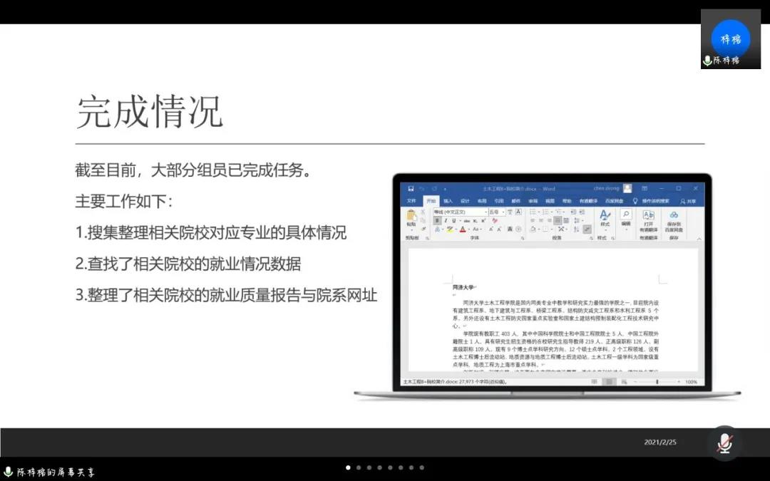 2020级土水海三班召开寒假作业中关于深造、就业方面的学习交流会,并进行线上班会。本次会议由班长张智棋主持,土水海三班全体同学参与。会议由5位组长代表学习小组轮流进行发言展示。
