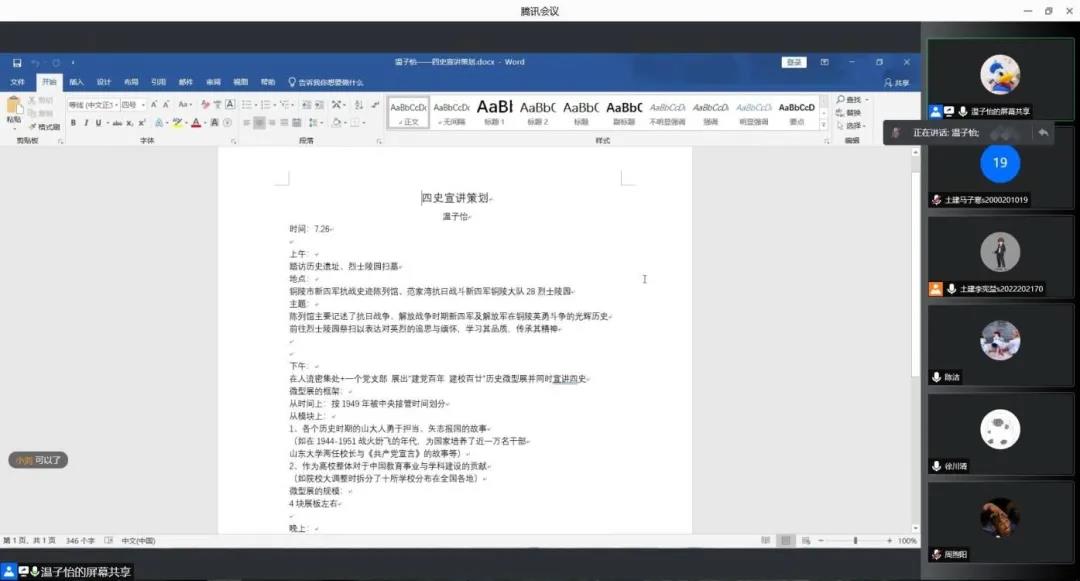 会议伊始,温子怡简要介绍了本次会议的内容。本次会议意在听取各位成员有关于本次社会实践的策划方案并在团队内进行完善调整。温子怡提出了微型展板的概念,提出进行四史的宣讲。分享完毕后,团队成员依次给出了建议,对温子怡的策划进行了深度的完善。陈洁提出与家乡当地的文化背景相结合,采访西南联大这一具有浓厚红色底蕴的地点;宋润森提出与当地的辅导教育机构合作,寓教于乐地进行对学生群体的宣讲;李宪益因暑期留校,也相应地提出在学校采访的策划方案。最后团队成员对每位成员的策划方案进行了完善。