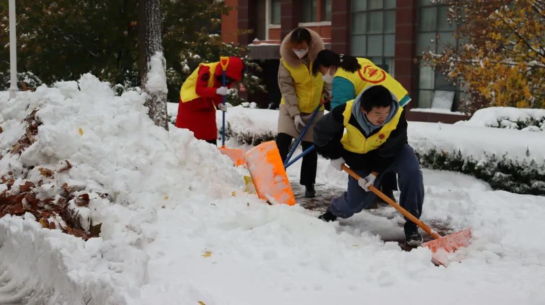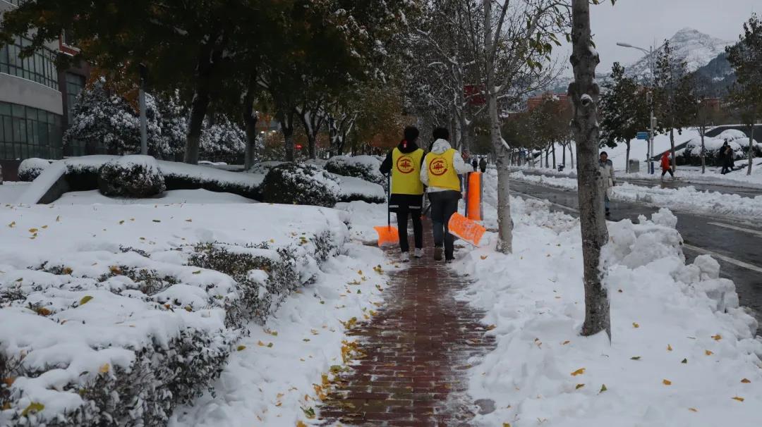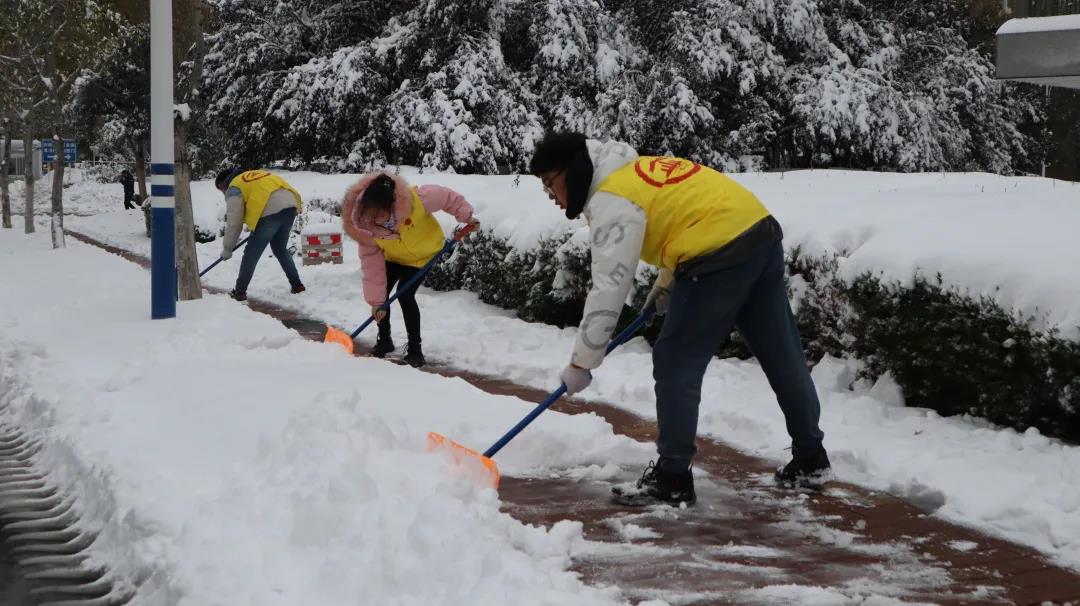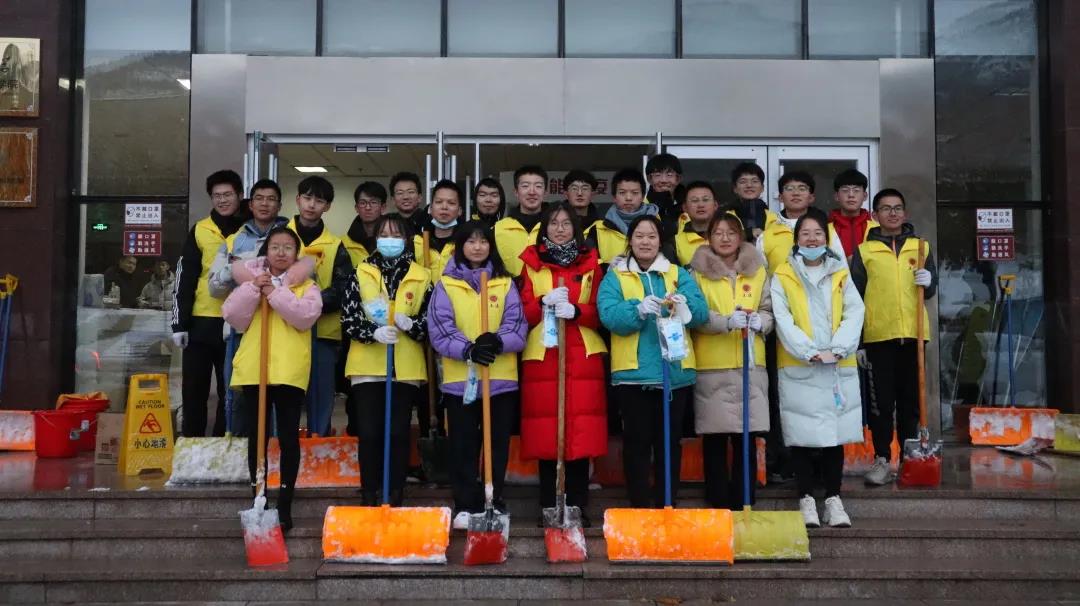 学生会组织志愿者开展“清积雪,辟康庄”积雪清扫志愿活动。