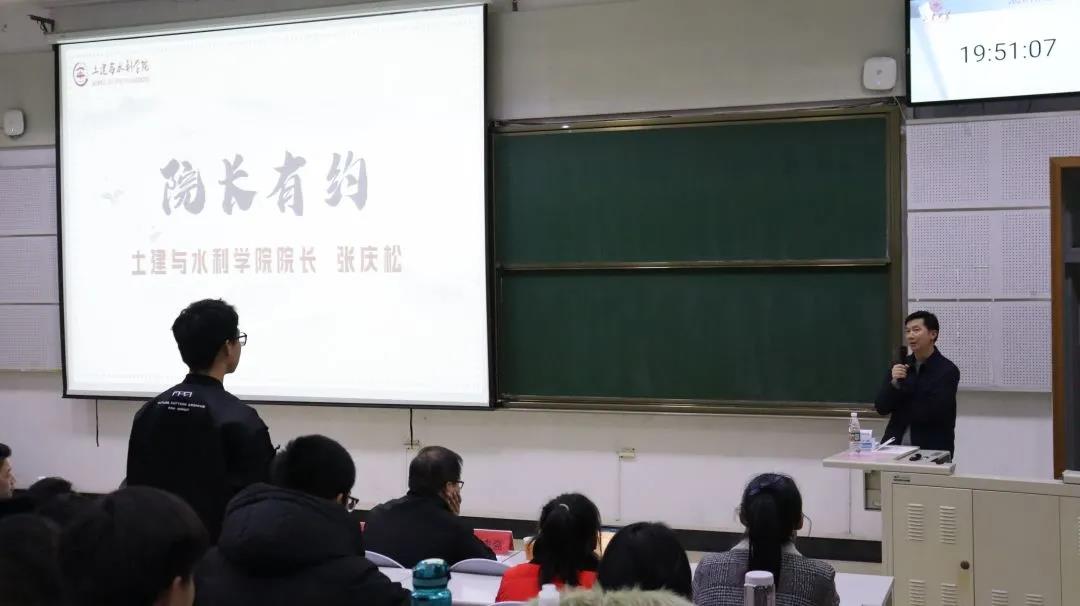 院长张庆松担任主讲人,副院长韩勃,党委副书记张强,2021级土木水利与海洋工程2班班主任刘其方、3班班主任王俊以及各年级辅导员出席,2021级全体同学参加。