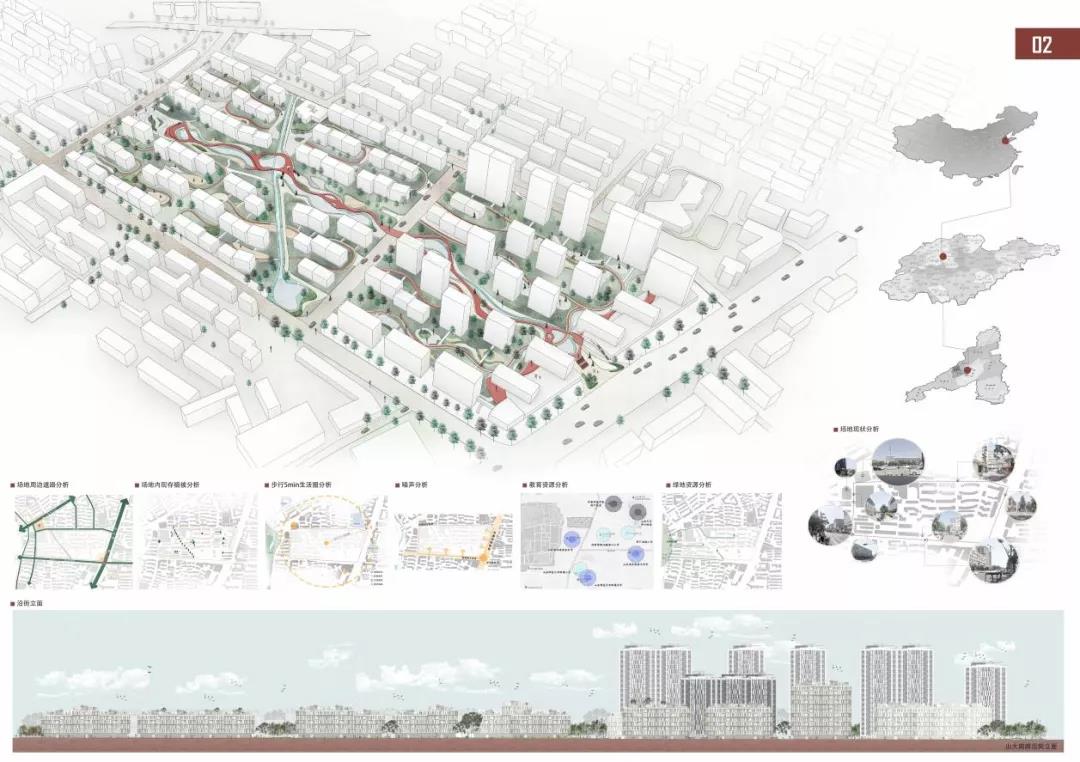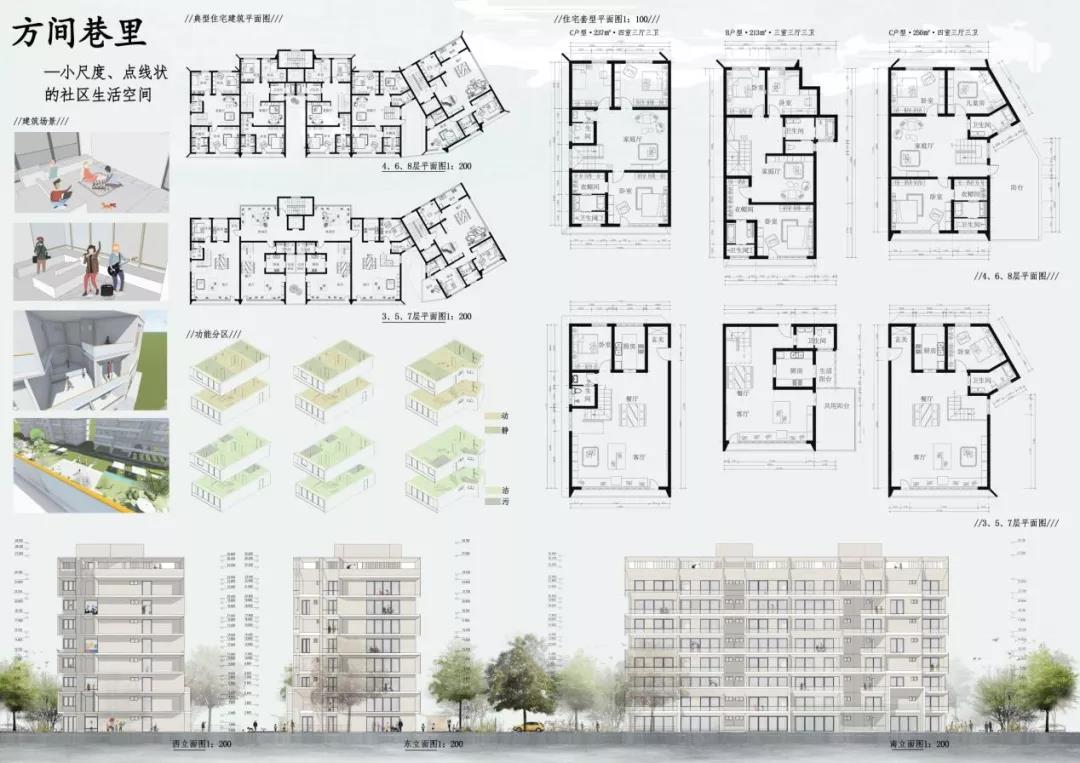 王璨的作品选取“方间巷里——市井生活"为概念,按照老社区原有的生活氛围设计,从空间肌理上来看是对旧有市井街巷的尺度重塑。综合考虑周边建筑、沿街小商业、经济商圈、噪声、人群活动、视野等方面进行设计。将周围居民、生活和行人融入社区,保留老社区原有的生活氛围,在社区内部依托街巷布置不同尺度的活动绿地,形成可容纳市井生活的生活天地。