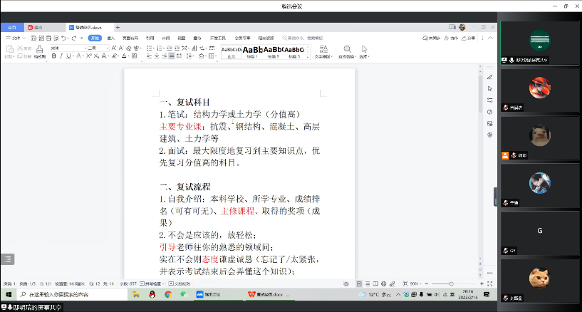 为丰富同学们应对考研复试的经验并为其准备工作指明方向,2月16日晚8时,手机比分-win007手机版 于线上举办土木工程考研复试经验分享会。本次活动邀请到了顺利考研至win007手机版 的张秀璇和考研至重庆大学的邸明瑞,2018级土木工程专业同学参与。