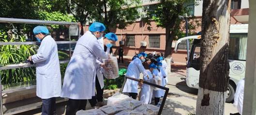 食堂志愿服务工作主要需要志愿者们分布在舜园和西苑食堂的门口、大厅,提醒同学们按照防疫要求戴好口罩、保持间距、快速打包,维护好食堂的用餐秩序,从而避免高峰期人群拥堵。在整个志愿服务过程中,我院志愿者们身穿红马甲,服从安排积极调度,坚守好自己的岗位。5月13日,由于中心校区同学返校后隔离一周供餐压力较大,我院志愿者与餐厅工作人员一起参加了中心校区饮食保障工作。学院志愿者按时到达集合地点,自觉佩戴口罩,按照要求穿戴手套、工作服,在食堂工作人员的指导下有序展开饭菜搬运任务。通过相互传递交接的方式将一份一份暖心盒饭送到大巴车上,共计搬运了3000份餐食。