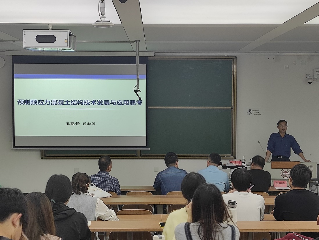 随后,侯和涛讲解了新型SC预应力混凝土叠合板技术研发与应用情况。他凭借幽默的语言,同时结合亲身接触的各个项目,深深吸引了同学们的兴趣点,使同学们了解到了施工应用的第一现场。最后,侯和涛表示同学们在理论学习的同时应该同样重视专业实践,并鼓励同学们积极投身于相关的科研活动中。