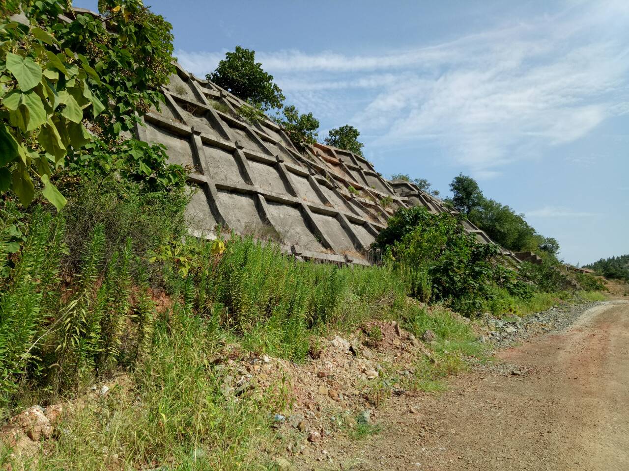 早晨七点,调研团一行八人从宾馆出发坐公交赴南山矿进行调研。到站后,团队便往凹山矿坑方向走,越往靠近矿坑的地方走,越人际罕至,但很明显的是,两边绿植也越多,农田密密麻麻攒至紧凑。除了路面因多年被拉矿大车碾压寸草不生,矿坑周边一片绿色,植物种类繁多,尤以樟树为最。因为矿坑是从凹山挖出来的,所以矿坑周围要进行塌方泥石流的防护工作,路边看得到矿坑周边斜坡都有方格水泥防护,而且水泥防护的空隙不乏有绿植生长。
