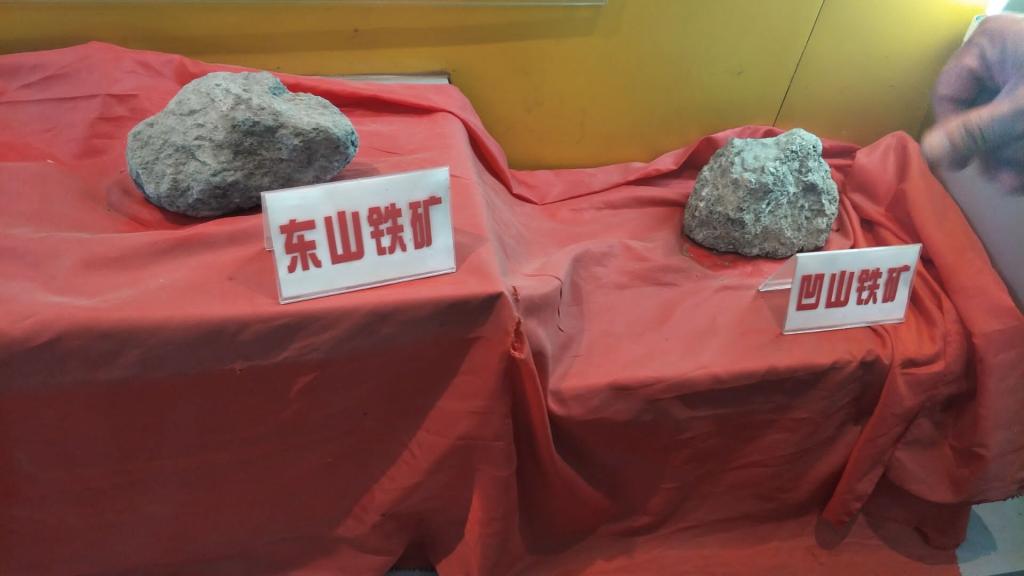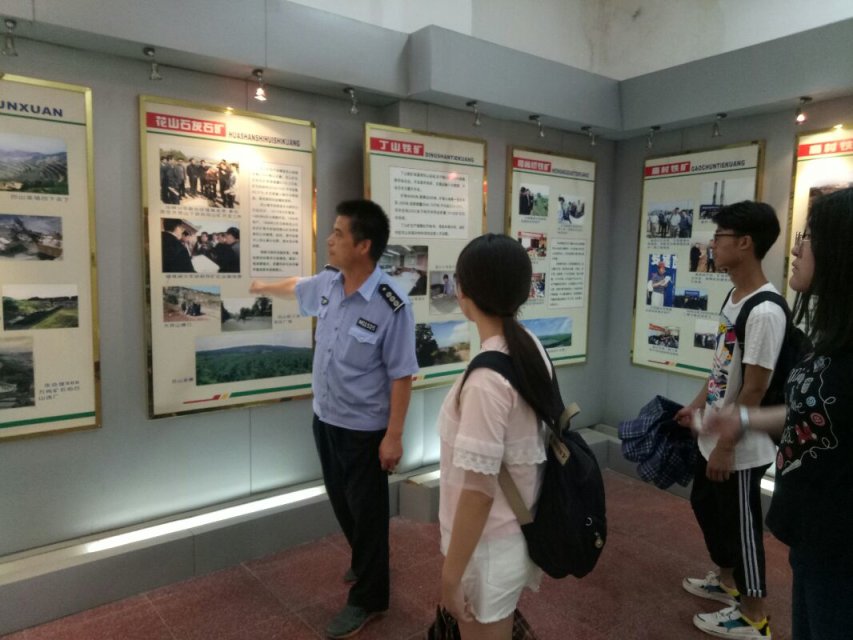早上九点,实践团全体人员在队长潘登带领下去了南山矿的矿产公司,在与公司相关人员取得联系后,实践团全体跟随相关工作人员参观了公司的各个展馆活动中心,其中尤以矿史馆的参观令人激动。在相关工作人员的解说下,团队了解到,南山矿从1912年被发现,开采至今有数百年历史。前期的不合理开采对环境造成了很大的损害,泥石流塌方等屡见不鲜。改革开放后,南山矿就很注意采矿炼石的后期环境治理了。废弃的矿场现在在进行尾料的沉淀和旅游开发,排土场也被开垦变成绿化区,炼铁产生的酸水等也有更高端的酸水库进行中和沉淀。实践调研团还有幸接触到了真正的铁矿石以及矿砂,据称他们选的矿砂质量十分高。