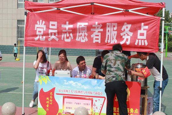 之后,工作人员带领队员们参观了当地党员志愿服务点,志愿者与队员进行了热情地攀谈。该处党员志愿服务点位于当地主要运动场所的篮球场一侧,主要作用为免费为运动场上的休闲、运动的人们提供开水。与此相似的志愿服务点还有多处,功能分为党政宣传、科普文化、移风易俗宣传、安全知识宣传等等,切实为当地文化建设做出了自己宝贵的贡献。