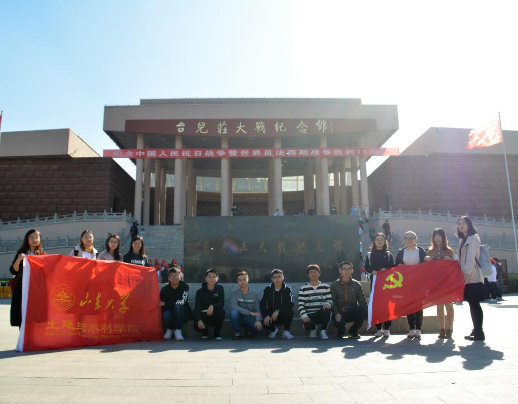 午餐过后,支部成员们开始了参观学习的第二站,台儿庄大战纪念馆。纪念馆是为纪念抗日战争初期著名的台儿庄战役而修建,融展览馆、影视馆、全景画馆于一体。在展览馆,党支部成员们认真阅读了英勇顽强的淮河阻击战,艰苦卓绝的临沂反击战,悲壮惨烈的滕县保卫战的相关史实资料,而辉煌的台儿庄歼灭战历史更是让大家感到振奋与感动;在影视馆,观看当年战地记者拍摄的珍贵纪录片《台儿庄战役》和故事片《血战台儿庄》以及《参战将士访谈录》,大家都被革命先烈不屈不挠、勇于牺牲的精神所感动,纷纷感慨没有前辈的付出,就没有现在的美好生活。大家表示,身为学生党员,更要提高觉悟,以身作则,奉献力量。