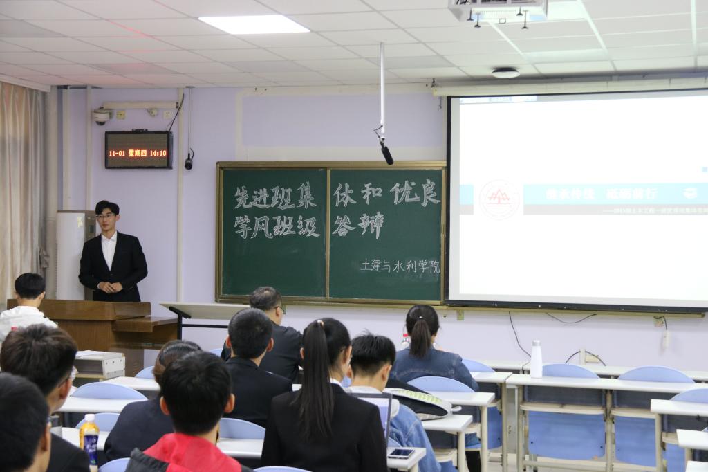 下午2点,答辩会正式开始,共有来自5个年级的19个班级进行答辩。各个班级代表主要从班级概况、学风建设、班级活动、所获荣誉和未来展望等方面进行了答辩,以图文结合、多人答辩等不同的形式介绍了班级的情况,主题各异,风格具佳,充分展现出班集体的优良学风和丰富日常。其中,14级建筑班代表以摄影展的形式,对班级的课程学习、外出实习、社会实践等情况进行了详细介绍,向在场观众展示了班级的个性风采,之后他以脚踏实地、相信自己八个字结束了本次答辩,赢得在场观众的阵阵掌声。15级土木一班的答辩人则以继承传统、砥砺前行为主题,从班级思想建设、科创比赛等方面进行了介绍。18级的各个班级还展示了目前仍在进行的手拉手志愿服务情况,并以图片形式介绍了班级项目的组织过程和初步成果。答辩结束后,梁莹针对答辩着装、时间把握、答辩特色等问题进行了点评指导,令在场同学受益匪浅。至此,手机比分