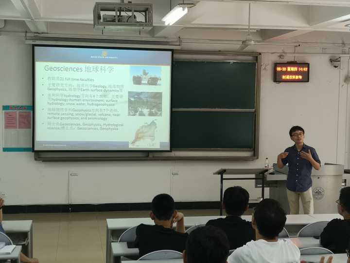 报告会上,牛起飞从地球科学专业的概况与现状展开介绍,通过对含水层的结构、水文对农业的影响以及全球视角下的水文三个方面的阐述明确了水文地球物理专业的研究方向及其对于生产生活实践的重要意义。为了增进与会同学的理解,牛起飞结合实例详细说明了电法、重力法等几种地球物理研究中常用的研究方法,并解释了各种方法针对的问题及区别。牛起飞还向大家展示了近年来数字岩石技术领域与渗透系数预测领域取得的突破与成就,结合水文地球物理研究领域存在的问题进行了具体的分析,并对该领域未来的发展做出了展望。在答疑环节,牛起飞就现场同学关于大学学习经验以及出国经历等方面的提问作了细致的解答,强调了明确学习兴趣与学习方向的重要性,令与会同学受益匪浅。
