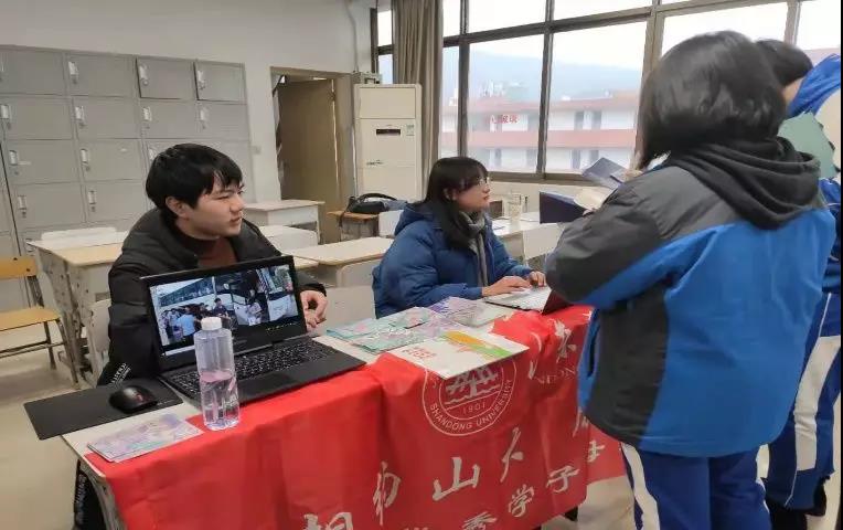 活动期间,有不少学生前来咨询山大报考事宜。王子瑶和刘子扬为高三学生解答了报考和专业知识相关的疑惑,了解目前学生的学习情况,并分享了自己的学习心得。其中,有一个学习成绩优秀的高三学生前来咨询。他说,自己的梦想就是有朝一日能够考入山大数学专业,回访组成员连连称赞。也有部分学生因为成绩不够理想而想放弃报考,王子瑶和刘子扬积极鼓励学生,不要放弃,最重要的是对学习的态度要一丝不苟。