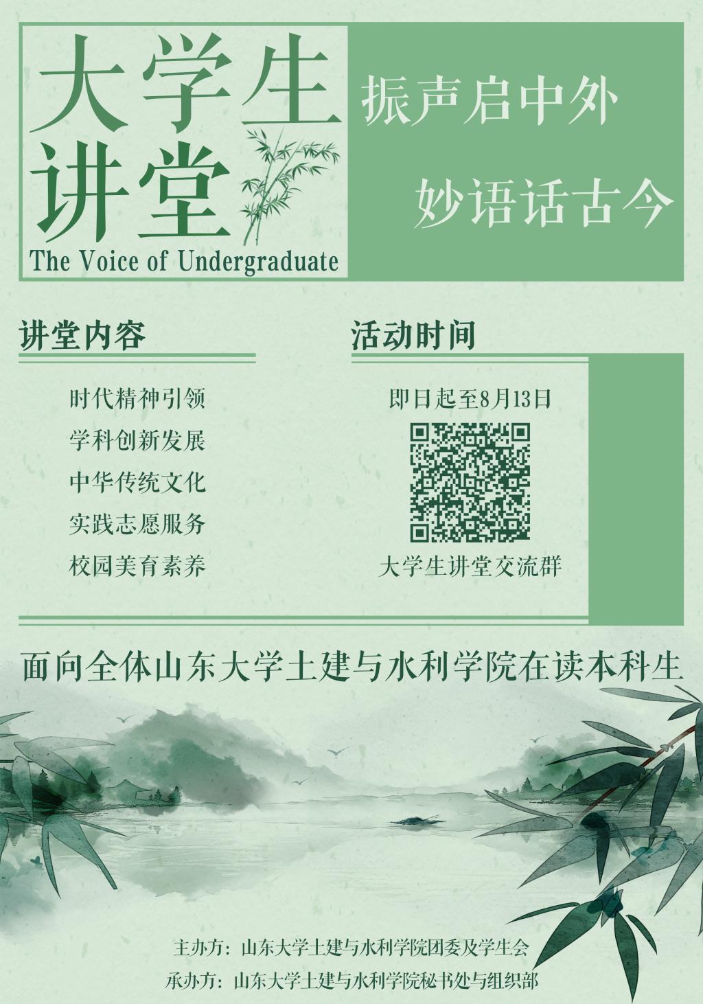 学生会主办的第七届大学生讲堂“振声启中外,妙语话古今”活动初赛经过选手一周准备和评委三天评审,活动工作人员核分,现已圆满结束。本次活动围绕“时代精神引领、学科创新发展、中华传统文化、实践志愿服务、校园美育素养”五个主题展开,参赛选手分别从自我、生活、时代等方面叙述对五大主题的思考和延伸,充分体现追求卓越、积极向上的学院氛围。学生代表评委经过培训,对参赛作品的报告内容、报告技巧、演讲效果等六个方面进行评分,主办方工作人员对打分结果进行核分,现将第七届大学生讲堂“振声启中外,妙语话古今”活动初赛十名入围选手名单公示如下: