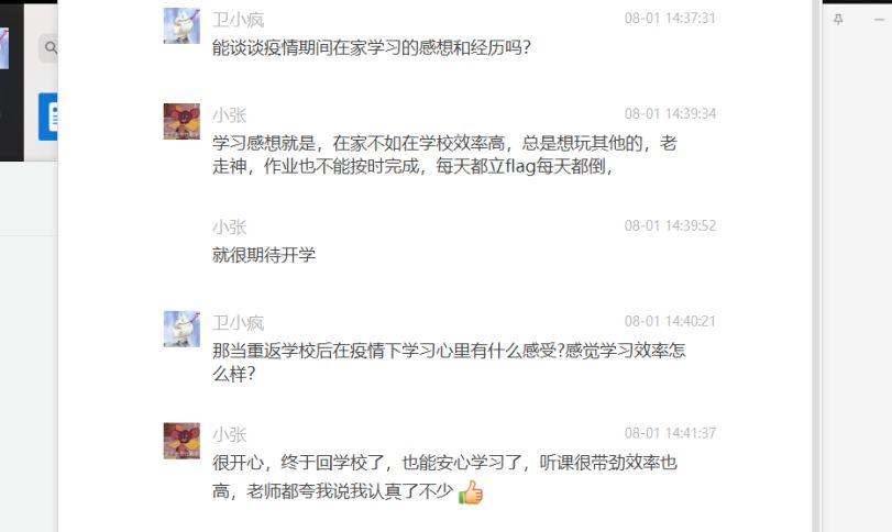 “疫情中高三学生备考”调研组于山东临沂开展了线上调研活动。调研组成员杨一萍与当地高三毕业生相互交流,并依据采访蓝本对其进行了采访。