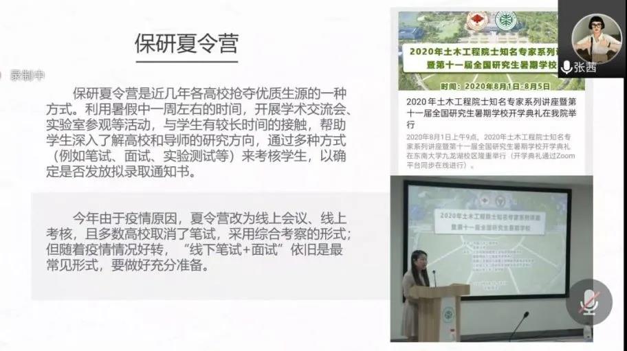 本次保研经验分享会由保研流程综述、详细介绍本校保研和各项单列保研、如何选择、如何准备四个方面展开。首先,郑星阳介绍了近几年土木工程系的保研率,建议同学们对自身条件进行评估,考虑自己保研成功的可能性。接着,他对“夏令营”、“预推免”和“九推”进行了简单介绍。张茜表示,学分绩点和比赛活动是取得保研资格的主要方式,同时强调了四六级的重要性。她向同学介绍了保研夏令营的参加流程,建议有意向的同学做好参加线下笔试和面试的充分准备。王晓阳从成绩排名推优和单列计划推优两方面进行讲解。他说明了手机比分