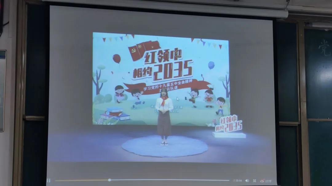 在党的十九届五中全会精神解读部分,同学们一同观看了《红领巾相约2035——学习党的十九届五中全会精神云队课》片段,听共青团中央宣传部讲述“我心中的2035”,在直播中,主持人强调,中国一直不断朝着邓小平提出建设小康社会这个方向发展。而党的十九届五中全会的召开,已经确立了全面建设小康社会的奋斗目标,同学们学习“十四五”会议精神,必须牢固树立并切实贯彻创新、协调、绿色、开放、共享的发展理念。