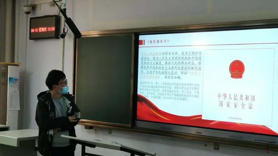 关于“全民国家安全教育日”,张旭从国家安全法、公民义务和反对间谍行为三个方面进行了分享。国家安全法明确了维护国家安全的基本原则和任务,规定了国家安全的基本制度,覆盖了国家安全各领域的工作,是一部名副其实的国家安全基本法。公民义务方面,张旭特别强调舆论安全:作为一名大学生,要有自己的判断力,不跟风、不传谣、不信谣,在网络和生活中始终谨言慎行是我们应尽的责任和义务。反对间谍行为方面,张旭通过播放相关视频让同学们直观的认识到间谍行为多种多样的形式,产生防范意识,并坚决的反对间谍行为。