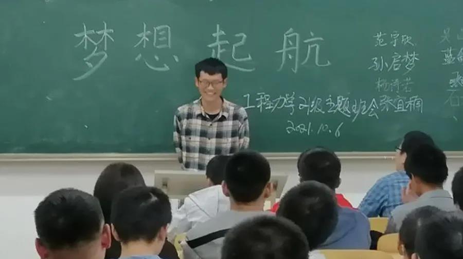 本次班会以“梦想起航”为主题。首先,在孙述鹏的组织下,同学们进行自我介绍并分享选择工程力学专业的心路历程。吴昌蔚称自己热爱中国古诗词,“挺喜欢搞理论的”是他选择工程力学的主要原因。孙启梦精通二胡,“爱挑战、爱困难”的性格让她选择工程力学。张仕龙说:“那天报完志愿后和父亲聊天,他很支持我的选择。”来自天南海北的同学们齐聚一堂,共聊理想,班会气氛异常活跃。