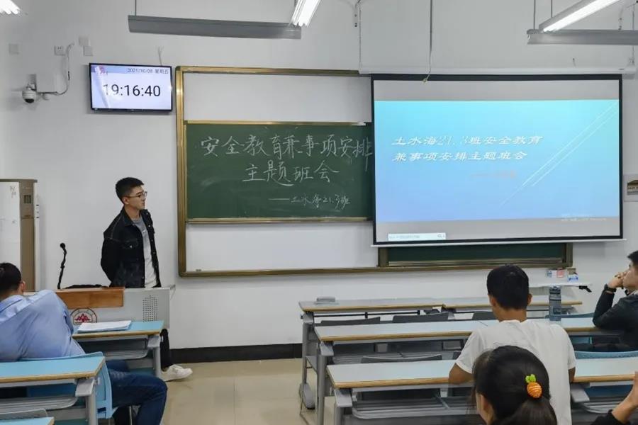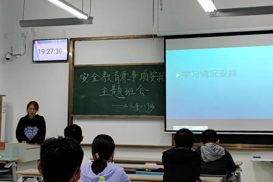 2021级水利系于教学楼召开安全教育兼事项安排主题班会。本次活动由班主任王俊,班长马骏凯主持,2021级水利系全体同学参加。