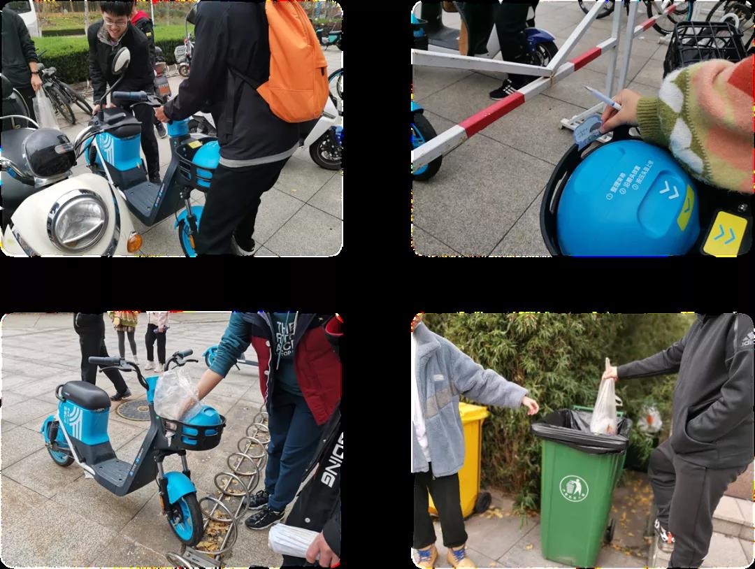 活动开始前,丁高文详细分配了志愿活动的任务,并将全体同学分为两个小组各自行动。本次志愿活动区域为兴隆山校区,主要针对教学群楼前后停车点、实验楼后停车点、欣园餐厅前停车点以及西北1门停车点几个主要停车点的骑行车辆进行摆放清理。到达活动区域后,志愿者们积极行动,明确分工。一些志愿者将阻挡进出的相关骑行车辆摆放到合适的位置;也有一些志愿者将共享骑行车辆中的垃圾和其他杂物捡拾到垃圾袋中;还有一些志愿者细心地将“文明小贴士”贴在共享骑行车上,提醒同学们随身带走自己的东西。