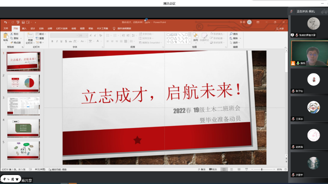 4月6日下午4时,2019级土木二班以线上会议的方式召开本学期第一次班会。会议由班长张政主持,班主任段抗出席,2019级土木二班全体成员参加。张政对近期疫情防控的注意事项和班级同学的未来规划进行说明。段抗强调了疫情防控的相关问题并提醒同学们提高网课期间的学习质量。他建议同学们做好今后的规划,对准备保研、考研、工作、出国留学的同学们做出动员,并对同学们的相关疑问进行了解答。此次班会进一步明确了同学们的奋斗方向,增强了班级凝聚力。