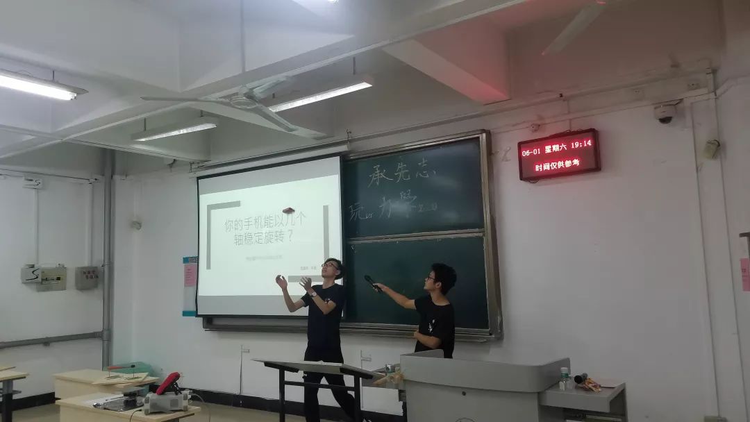讲座伊始,李熠与黄耀昕分享了对手机绕轴旋转问题的研究。他们在调查中发现,目前网络上尚未出现这方面的权威解释,通过周密的分析与思考,两位同学给出了自己的解答,并向大家展示了自己的分析与计算过程。主讲人李浩隆则借助仪器演示了“克拉尼图形”的形成。演示完成后,王少伟进行了点评,并为同学们深入讲解了其中的原理。实验后,李浩隆又带领大家完成了“乒乓陀螺”、 ““声音变图案”、“钢珠喷泉”等几个有趣的力学实验。