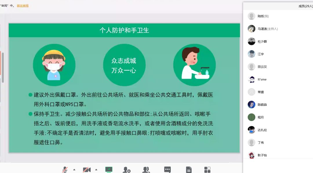首先,马湛涛简单向同学们强调了现在疫情的严峻情况,并叮嘱大家按时填写网上体温登记表。同时他就疫情期间应注意的事项提出了几点建议,提醒同学们要尽量减少外出,多开窗通风,保持室内环境整洁,勤洗手等。随后,面对每日繁重的网上学习任务,马湛涛要求同学们及时调整心态,努力适应各科的授课方式,积极配合老师的授课,自主做好本学期的自我规划,以良好向上的心态面对这与以往不同的新学期。他认为,虽然我们暂时还没有能力到前线去贡献力量,但安心待在家里,认真做好自己的学习任务便是对国家疫情防控最大的支援。最后,在“班委有话说”环节中,体育委员杨卓提醒同学们在家不要忘记锻炼,应适当进行一些简单运动,养成良好的作息以饱满的精神迎接新学期。在班会尾声,同学们还就网上作业的完成情况进行了激烈的讨论,大家纷纷表示还是在学校面对面的学习更轻松愉悦,期待能返回学校的那一天。
