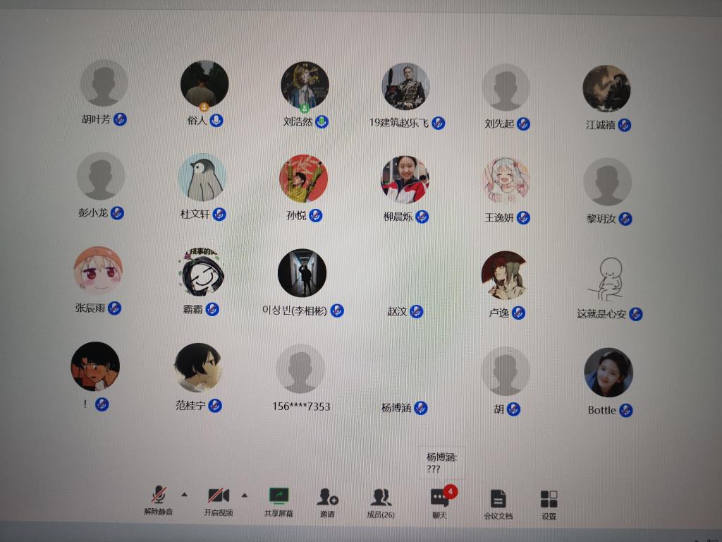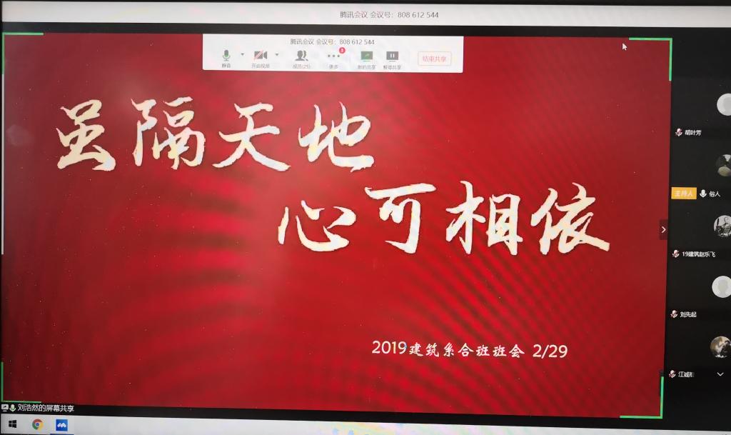 2019级建筑学系全体同学进行线上会议。会议由建筑一班班长刘浩然、建筑二班班长李特共同主持,建筑一班宣传委员胡叶芳记录会议内容,2019级全体建筑系学生参加。