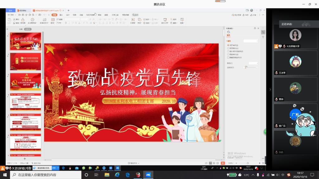 2018级水利水电团支部召开了以“弘扬抗疫精神,助力脱贫攻坚,展现青春担当”为主题的线上团会,会议由团支书李圣萱主持,水利班全体成员参加。